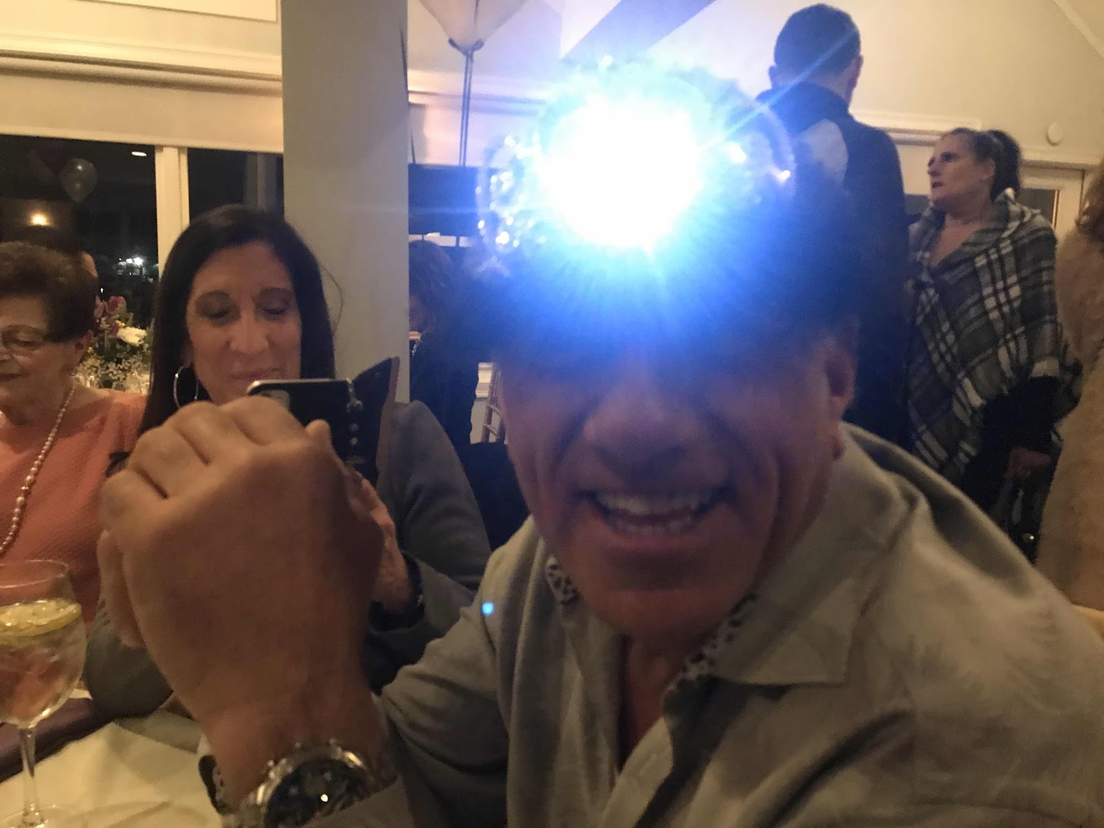 Jane bought us all these great hats so we could be seen in the dark. Jane V bought us yellow reflective vests road workers wear so we can be seen in the dark. We have been doing this walk on Fridays for more years than I can count. 4 girls with vests, hats with lights and more can now be seen totally in the dark.