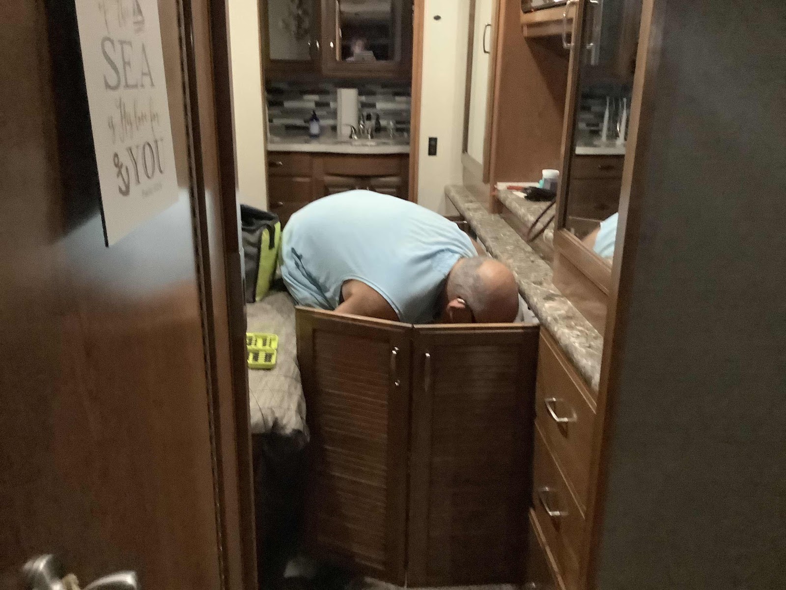 Poor, Tom, taking apart the wooden framework around the washer /dryer so when Reliable Bill comes tomorrow to repair it, we hope.