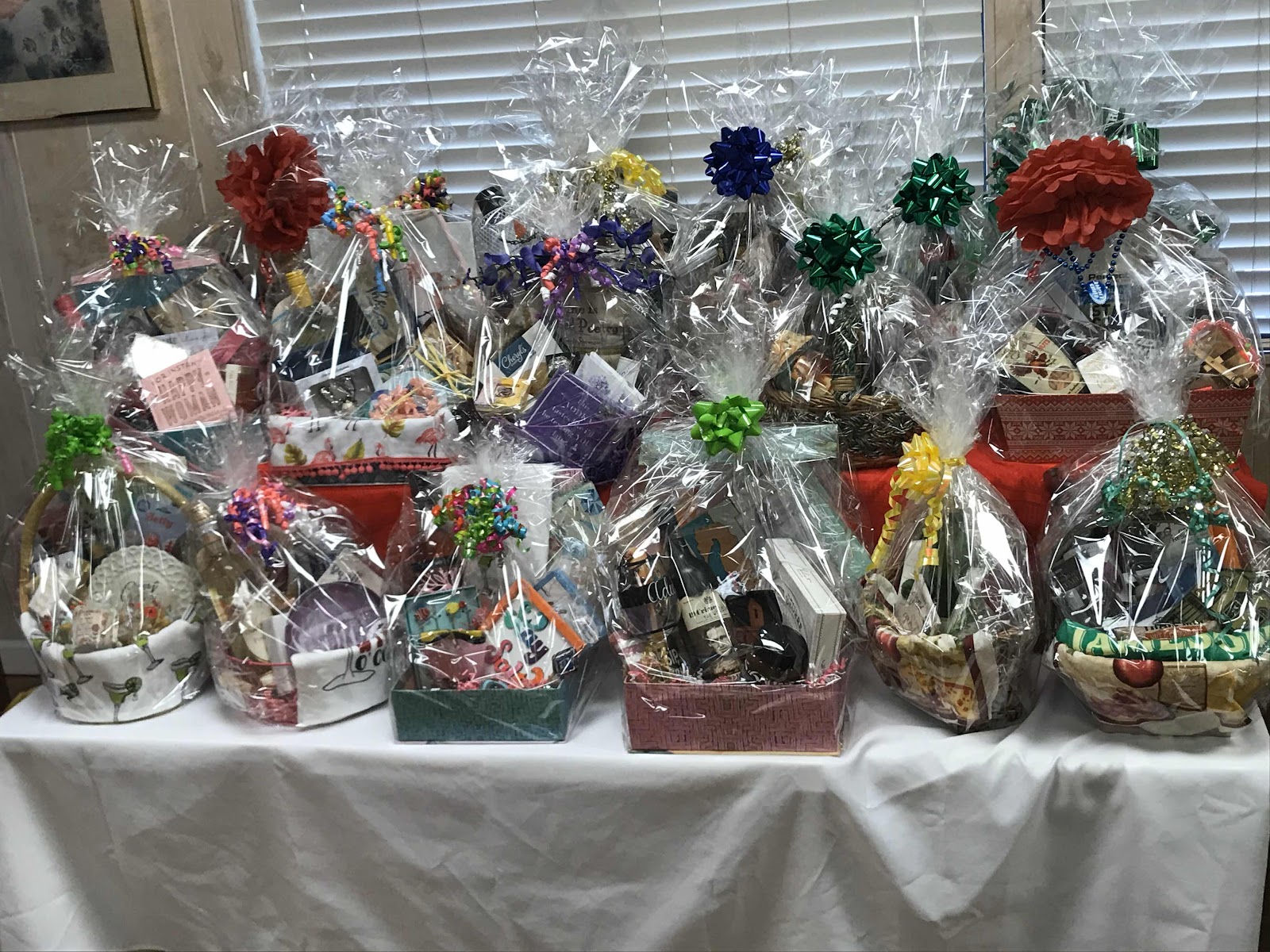 WE SET UP THE RAFFLE BASKETS, CHAIRS, AND TABLES