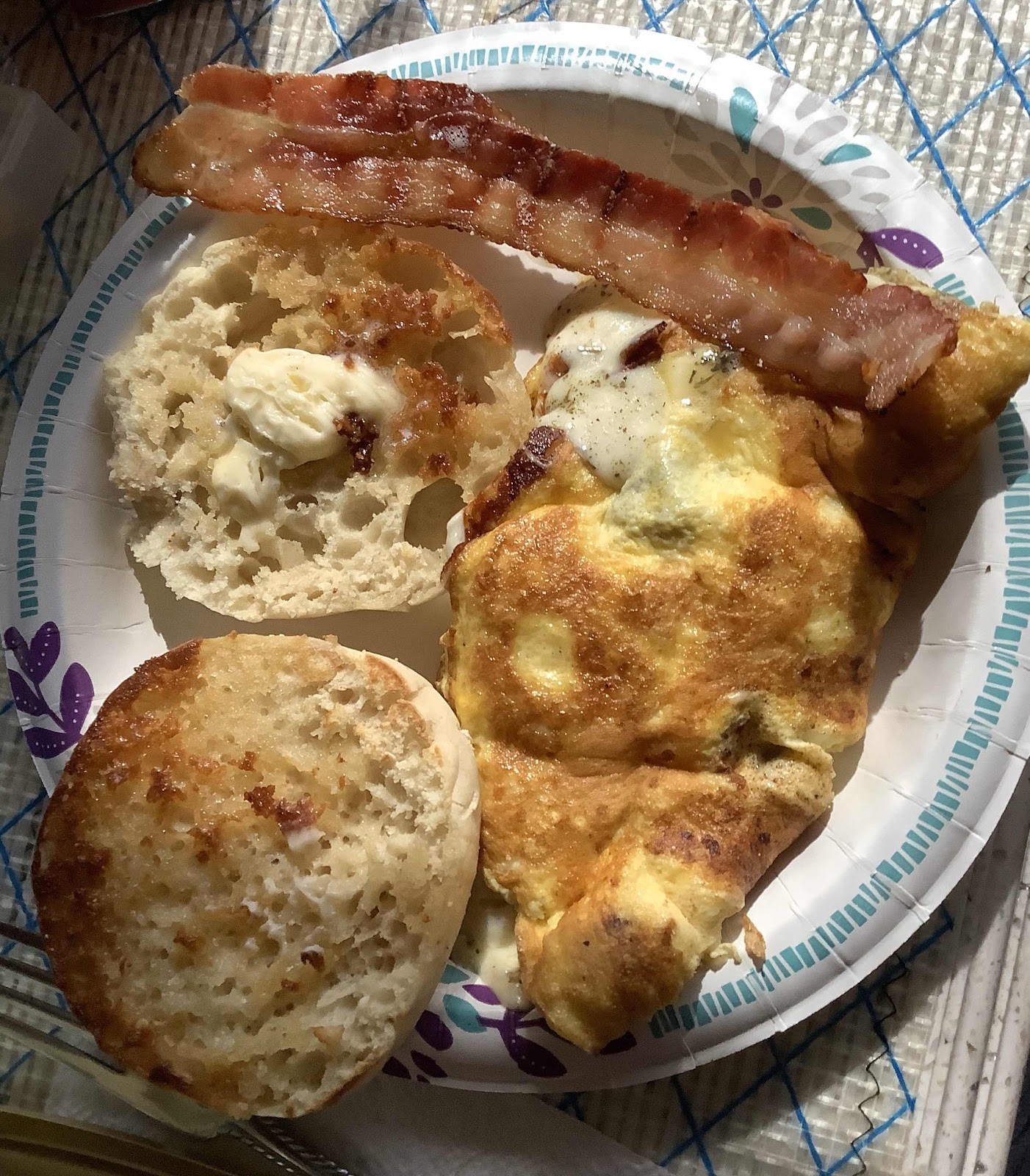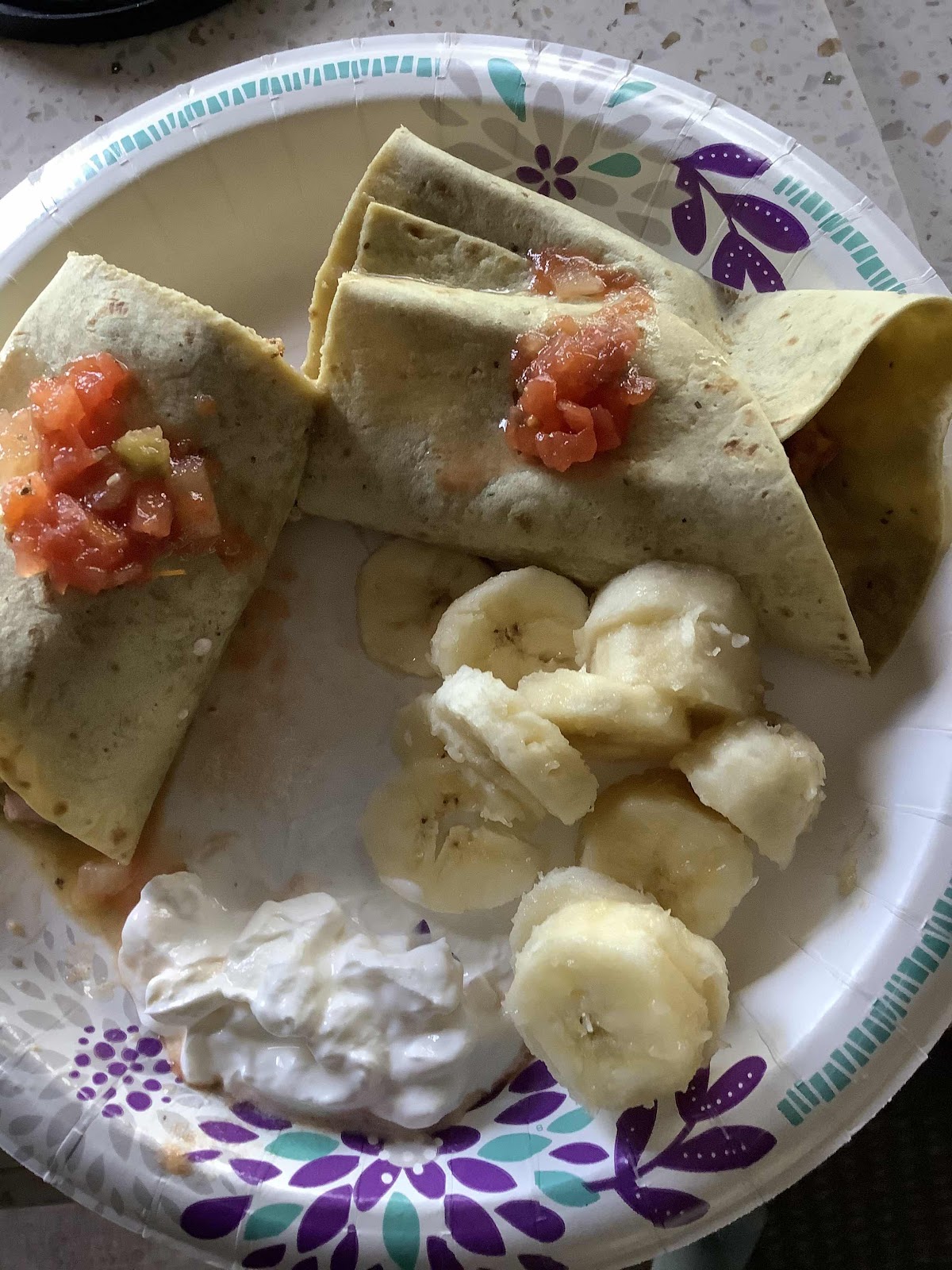 HOEVRES RANCHEROS WITH EGG, BACON, SOUR CREAM, SALSA, AND GUACOMOLE, BANANA SLICES