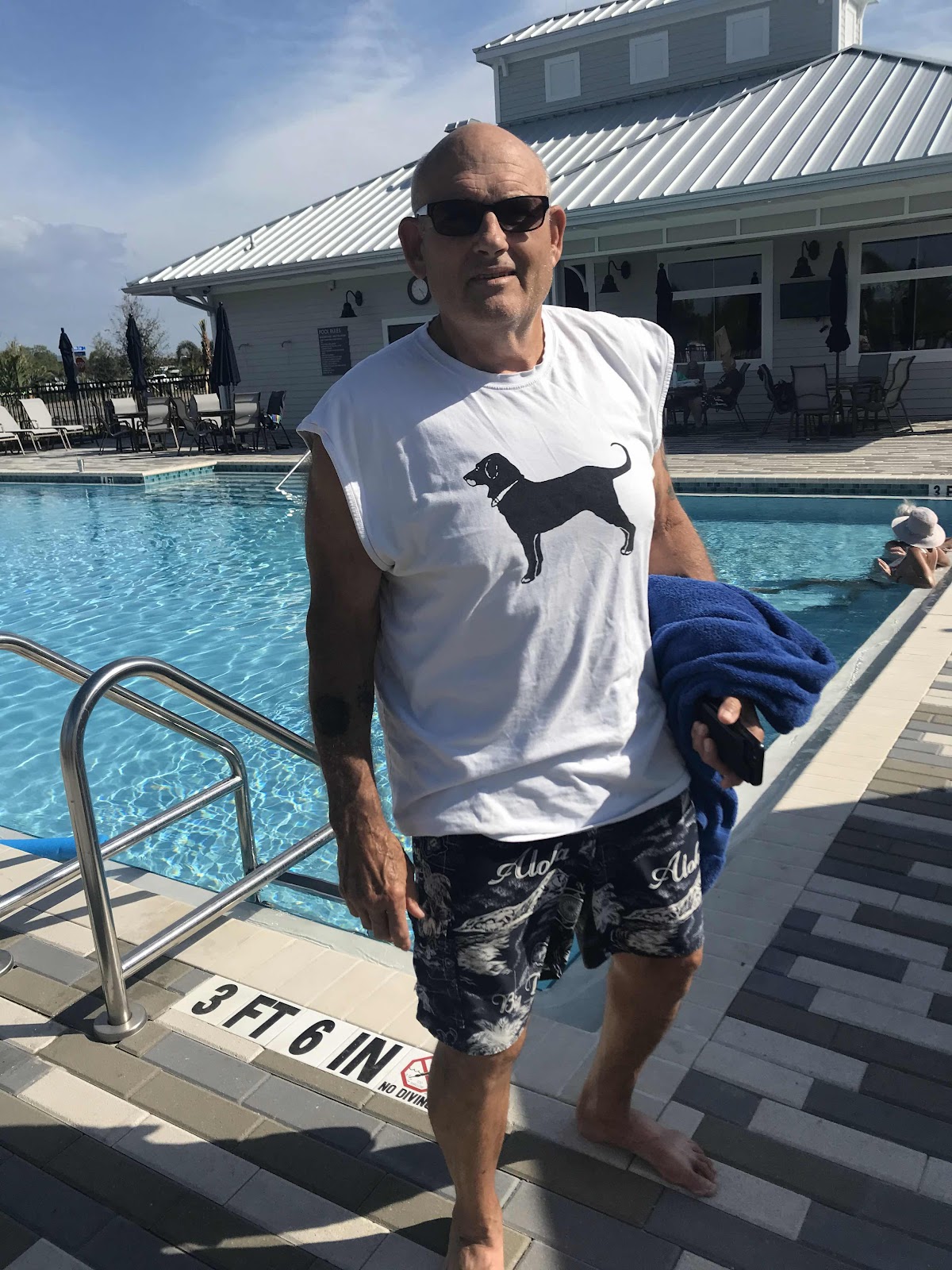 Tom had this shirt on for Lucky Dog. The resort activity director Toni asked to take a photo of him with his 'dog shirt' on. There were only two dogs at the event. Toni said she thinks people dont want to be around others with the virus. I think there just wasn't enough advertising.