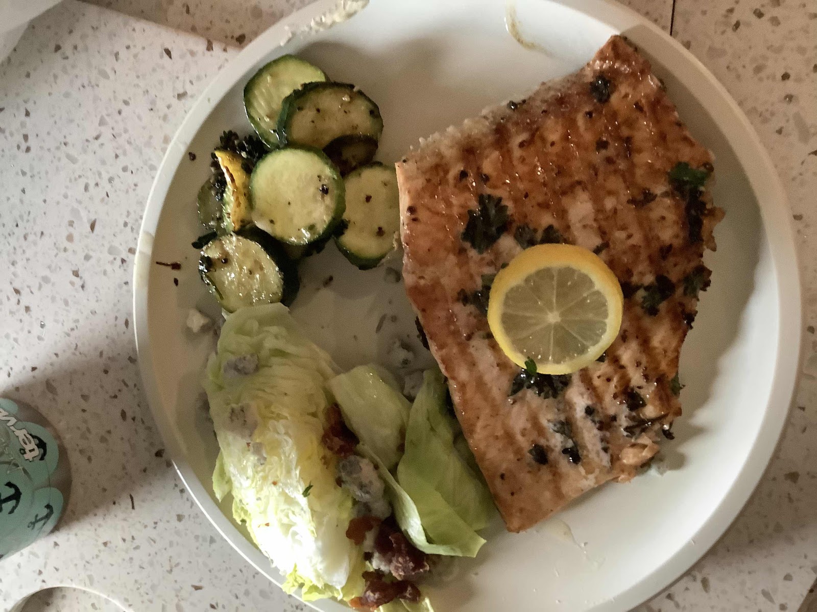 GRILLED SALMON, GRILLED SQUASH, LETTUCE WEDGE WITH BLUE CHEESE CRUMBLES AND BACON.
