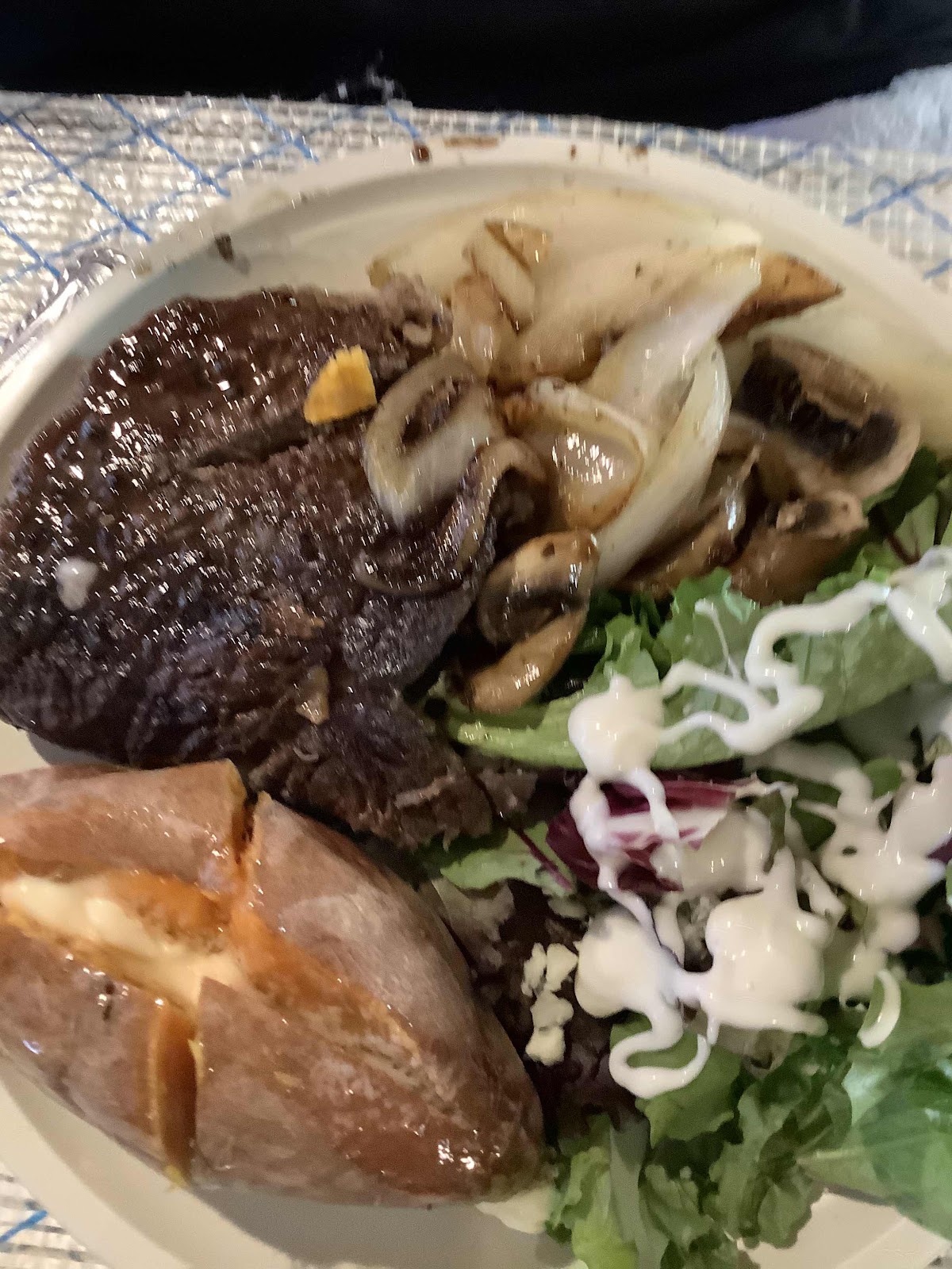 Dinner: Grilled RibEye with sweet potato, grilled onions and mushrooms, and a mixed green salad with blue cheese and bacon bits.