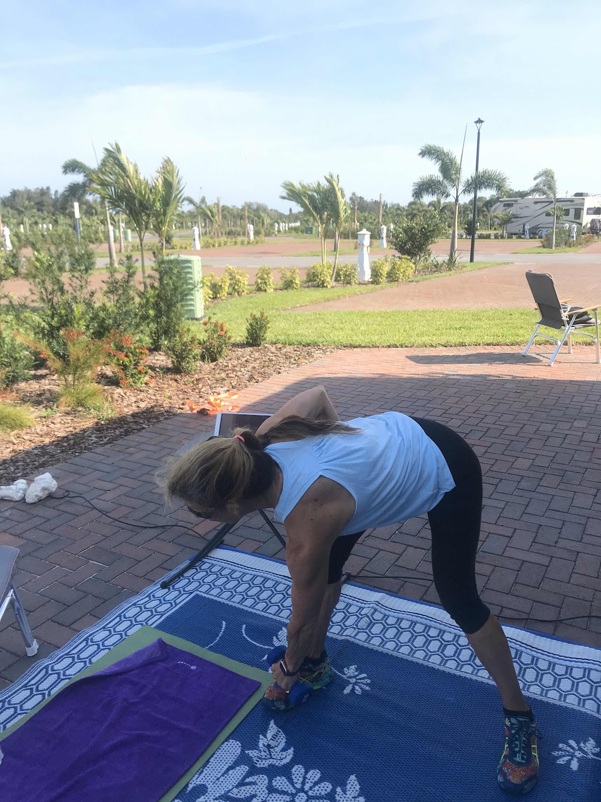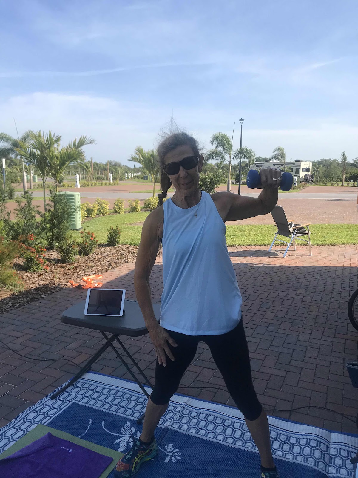 After dinner we went for a bike ride. It felt good. Very breezy and warm. We passed many others in the 3 parks we rode through riding bikes, strolling, and golf carting around. Is that a word?