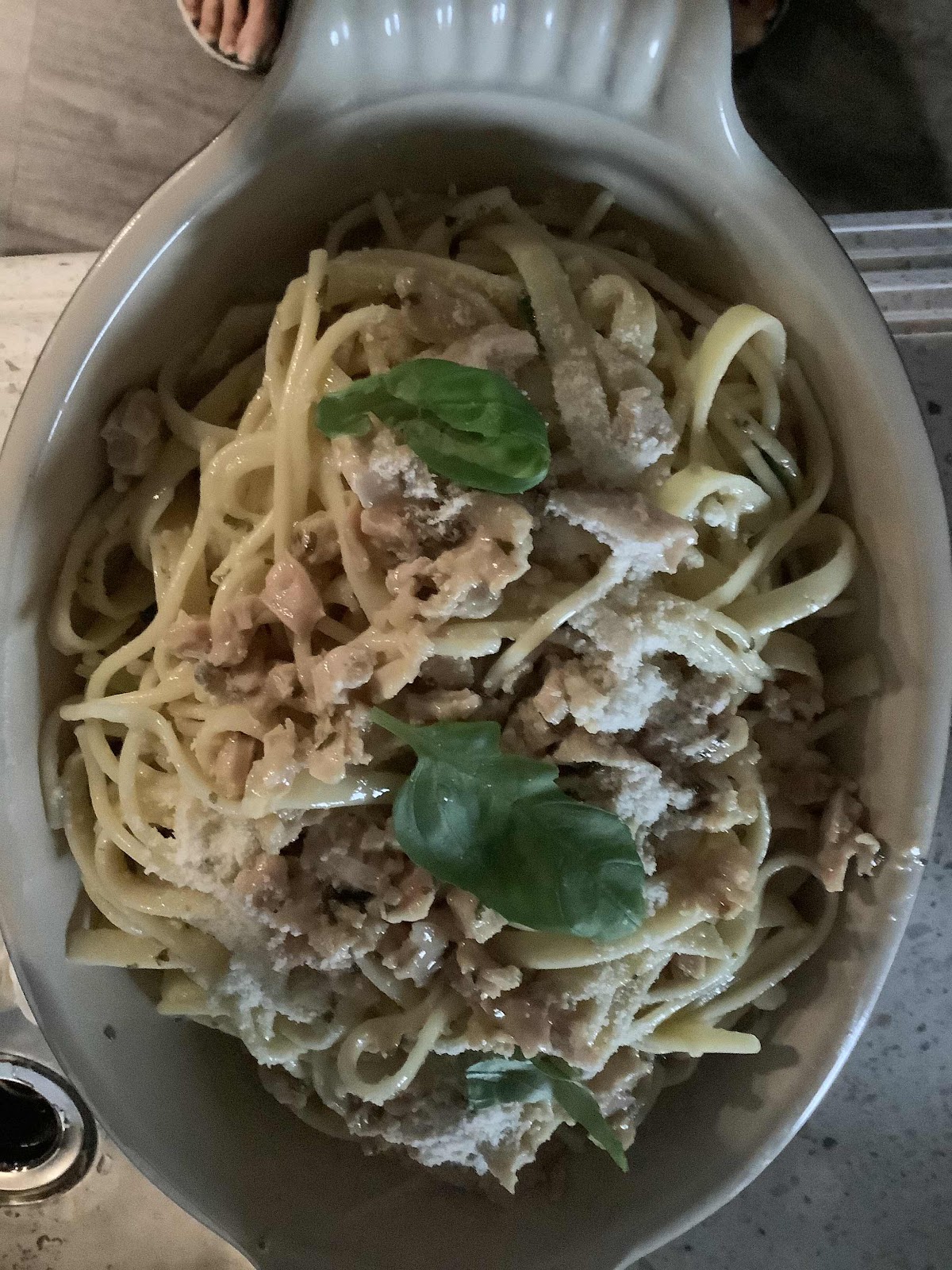 DINNER: LINGUINE AND WHITE CLAM SAUCE: LOTS OF FRESH BASIL, WHITE WINE , AND CHOPPED CLAMS