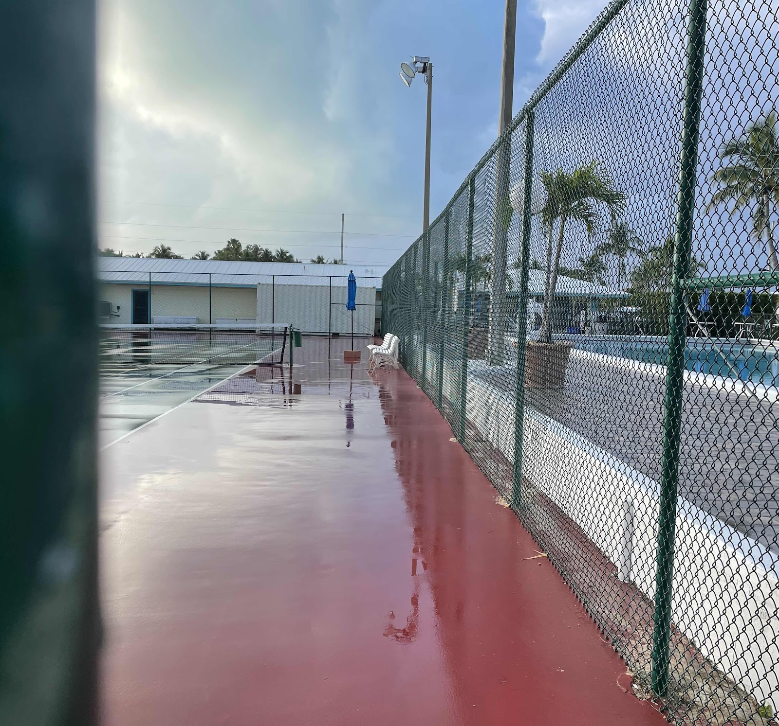 THIS WAS THE WAY THE COURT LOOKED AT 7:15 am so I was happy when Chuck was able to, after the rain, squeegy the court. I was able to play 2 games when the rain began again. Wishful thinking that we could play and the rain would stop'. No such luck. I returned to the RV to make breakfast.
