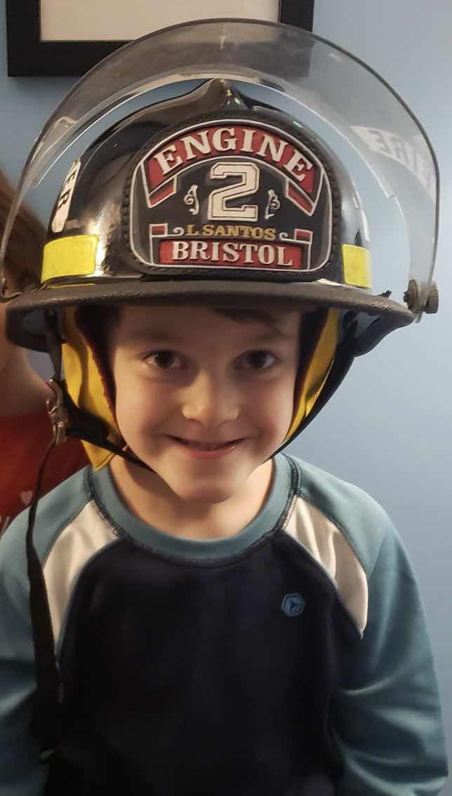 LEO WROTE A NOTE TO UNCLE ANTHONY FOR THE AMAZING HELMET, FIRE MEMORABILIA, AND NAME BADGE