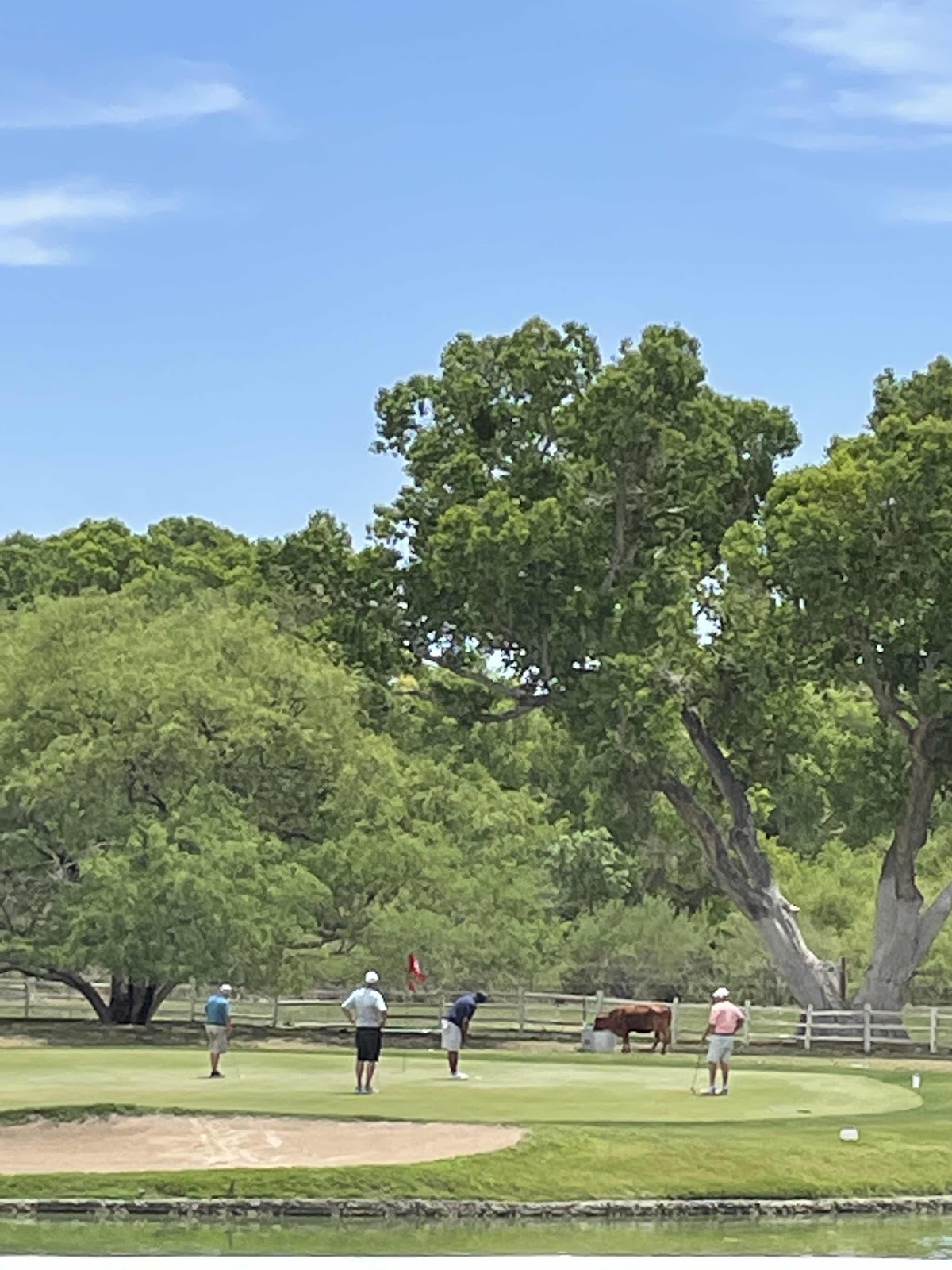 Next stop lunch at a country club with colorful flowers and grounds. The men playing golf were greeted by a cow!